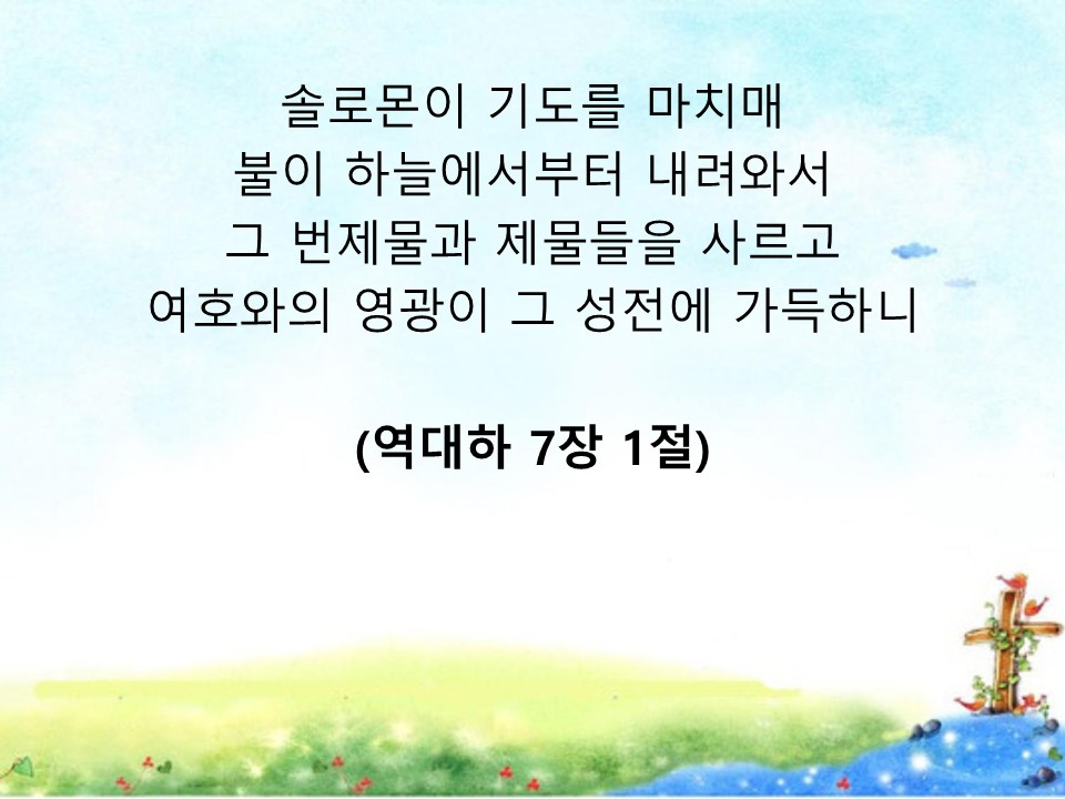 "솔로몬이 기도를 마치매 불이 하늘에서부터 내려와서 그 번제물과 제물들을 사르고 여호와의 영광이 그 성전에 가득하니 여호와의 영광이 여호와의 전에 가득하므로 제사장들이 여호와의 전으로 능히 들어가지 못하였고 이스라엘 모든 자손은 불이 내리는 것과 여호와의 영광이 성전 위에 있는 것을 보고 돌을 깐 땅에 엎드려 경배하며 여호와께 감사하여 이르되 선하시도다 그의 인자하심이 영원하도다 하니라" (1-3절)