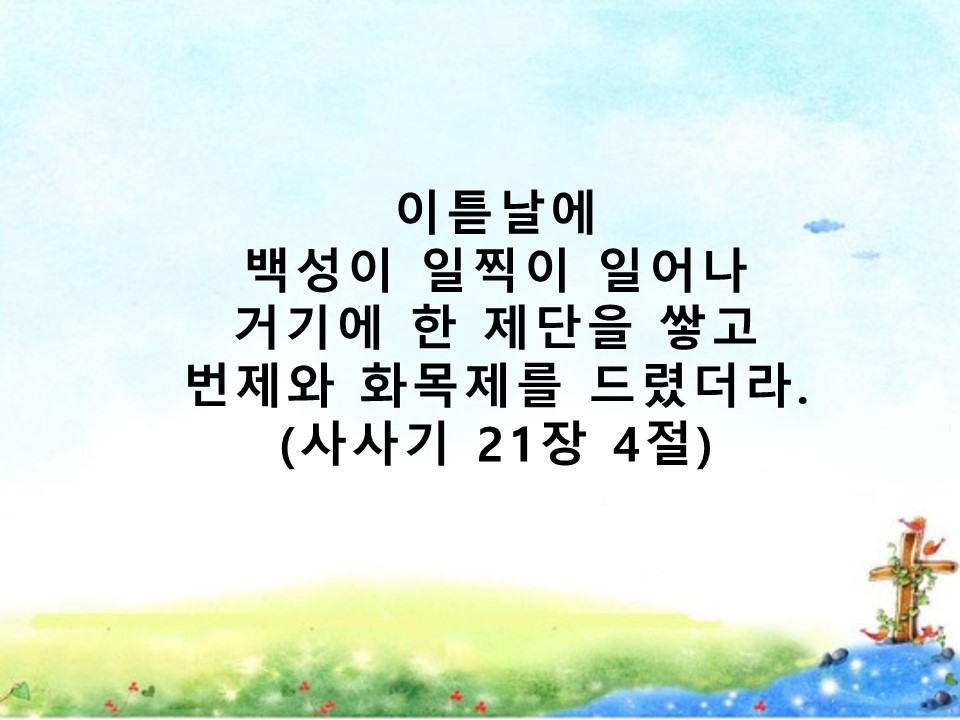 4 이튿날에 백성이 일찍이 일어나 거기에 한 제단을 쌓고 번제와 화목제를 드렸더라